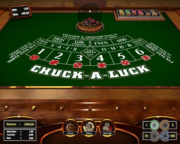 Nopanheitto ja kasinopelit ovat olleet verraton kombinaatio, eikä chuck-a-luck ole poikkeus tähän sääntöön. Tässä Foxwoods Casinolla Connecticutissa erityisen suositussa pelissä pääset lyömään vetoa kolmen nopan tuloksesta. Toisin kuin craps-pelissä, jossa pöydälle vieritetään numeroituja noppia, chuck-a-luck pelin noppia säilytetään eriskummallisessa munakelloa muistuttavassa rasiassa. Pelaajat pääsevät lyömään vetoa erilaisista numerokombinaatioista, ja parhaat arvaukset tuovat mukanaan myös suurimmat voitot.